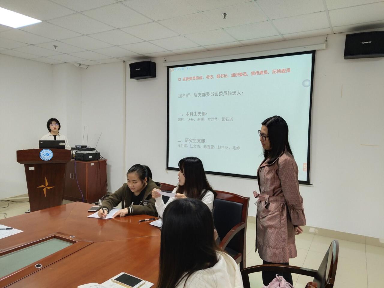 本次活动议程有支委换届选举、交纳党费、专题学习、主题研讨等四项内容。首先,由周晓峰老师主持换届选举,根据《中国共产党支部工作条例(试行)》相关要求,由上级党组织指派周晓峰、盛文军同志分别担任beats365本科生支部和研究生支部书记。随后,公布由上级党组织提名的支委候选人,正式党员严格按照选举程序进行差额投票。由胡红霞书记监票,预备党员任豆豆、田梅萍分别负责唱票和计票,选举产生本科生支部支委成员魏林、谢晖、华丹、邵钰琪,研究生支部支委成员汪文杰、赵世纪、毛婷、肖明媚。随后,胡红霞书记表示,以后,将从严支部建设,严格把控推优、发展党员等各项工作,同时也殷切希望党员同志们能重视每月主题党日学习活动,守规矩、讲纪律、做表率。