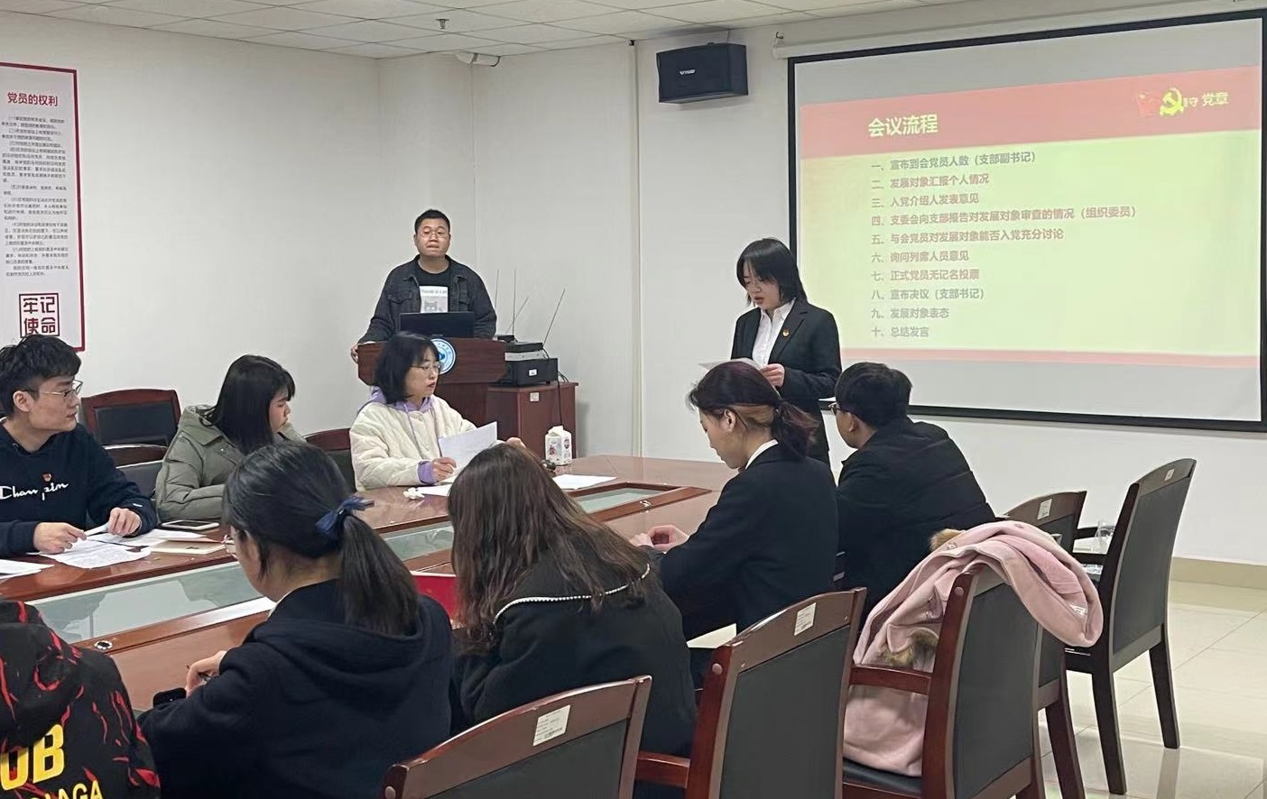 支部副书记魏林宣布到会有表决权的正式党员人数超过应到会有表决权人数的半数,会议有效。然后裴雯珂和庞颖等两名发展对象就个人情况向党组织进行汇报,在其入党介绍人分别发表意见后,支委会向支部报告了对发展对象的综合审查情况,与会党员对发展对象能否入党进行了充分讨论,最后正式党员进行无记名投票,裴雯珂和庞颖获得赞成票数超过应到有表决权正式党员的半数以上,支部大会通过了接收发展对象为预备党员的决议。