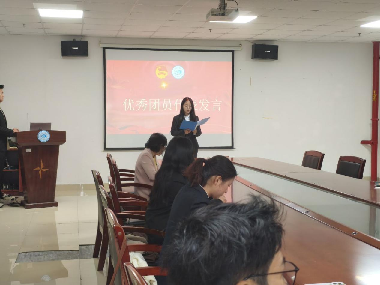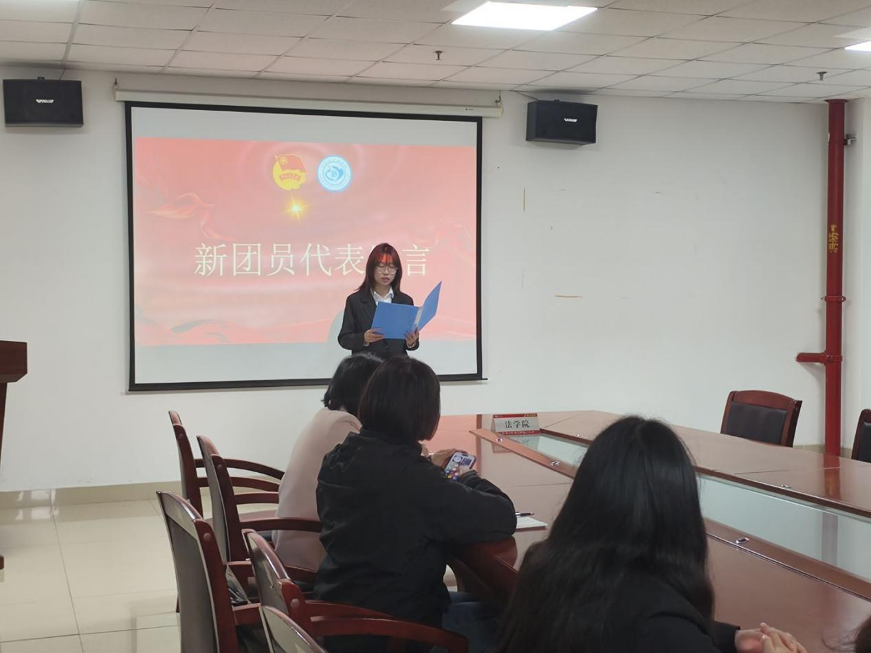 宣誓完毕后,法学12304班何梦秋作为新团员代表发言。她表达了对团组织的无限向往与感恩之情,并郑重表态,未来将以团员标准严格要求自己,勤奋学习、锤炼品格,积极投身集体建设,在实践中增长才干,不负青春、不负韶华。随后,优秀团员代表桂钰琳结合自身成长经历,分享了在团组织培养下的进步与感悟。她鼓励新团员们珍惜团员身份,主动担当责任,在志愿服务、学术科研、社会实践中勇挑重担,以实际行动诠释团员的责任与担当,向党组织靠拢,在青春赛道上奋力奔跑。
