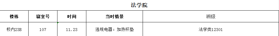 根据公司十一月宿舍巡查情况,公司共有1间寝室使用违规电器,具体情况如下:(表格显示)
