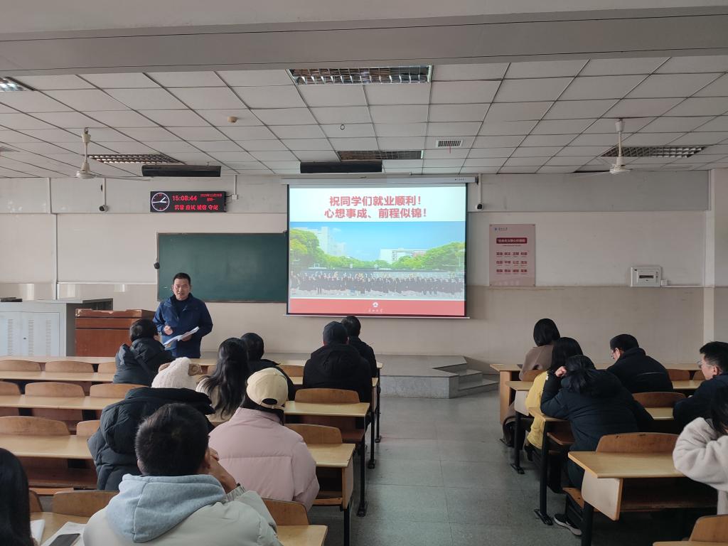 会议第二部分,辅导员盛文军做毕业生就业动员大会,汇报了今年考公考编上岸情况,要求大家关注各类就业信息,介绍了公司网上签约系统。