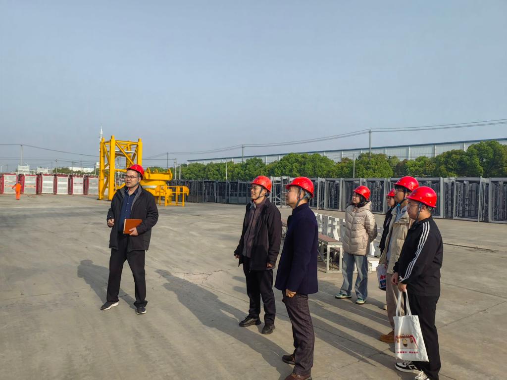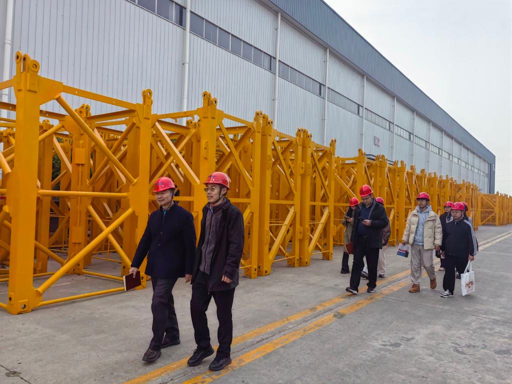 到达公司后,在企业负责人陪同下,书记一行先参观生产车间。车间里,先进的机械臂和自动化生产线在运行,工人们忙着生产。周胜美和技术人员、工人交流,询问产品生产工艺和质量控制情况,了解建筑工程机械设备生产流程。